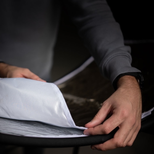 - La tela es fácil de sujetar al reflector gracias al cierre de velcro.
