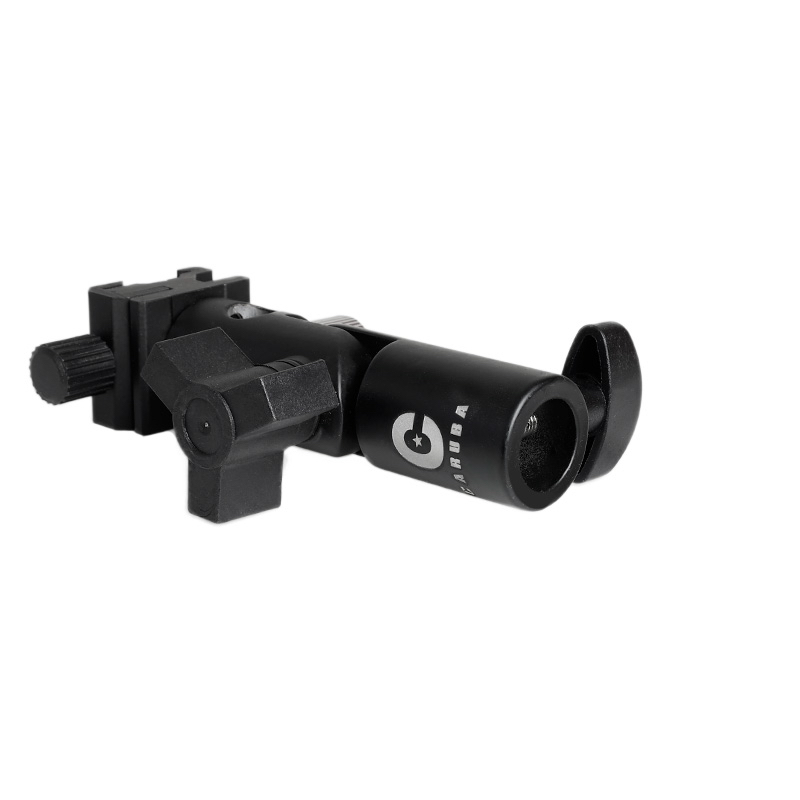 Este soporte Caruba, fabricado en aluminio, permite montar un flash compacto en un trípode de estudio junto con un paraguas. Permite ajustar el ángulo de inclinación y es compatible con cualquier trípode de estudio que tenga tija de sillín.