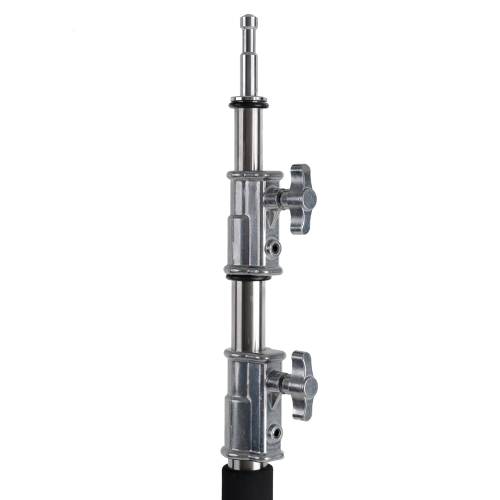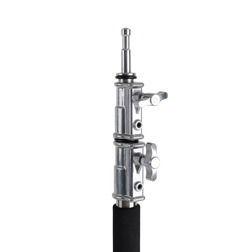 - Conexiones universales: La parte superior del trípode tiene un soporte de espiga universal para facilitar la instalación de diferentes equipos de iluminación. La jirafa incluye una abrazadera con aberturas y espigas universales en ambos extremos.