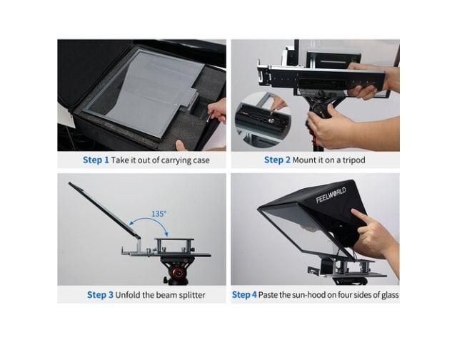 - Graba contenido guiado con tu cámara, videocámara o PTZ con este teleprompter plegable FeelWorld TP16 para tu próxima transmisión en vivo, presentación o entrevista. Convierte tu tableta en un teleprompter con la abrazadera incluida, que admite dispositivos de hasta 16″. El vidrio divisor de haz 70/30 se encuentra en un ángulo de 135° para una máxima visibilidad, y el parasol incluido admite lentes gran angular de 24 mm o más. Los tornillos de 1/4″ aseguran el dispositivo de grabado de su elección al marco de aluminio en orientaciones horizontales o verticales.