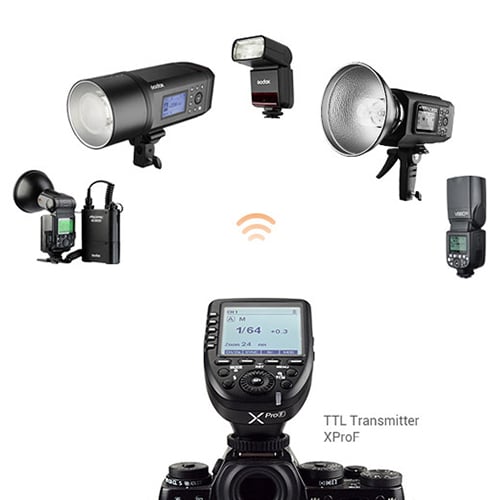 Se incorpora un sistema de radio XProS integrado de 2,4 GHz para el disparo inalámbrico con un transmisor comprado por separado con un alcance de 164 pies. El sistema es compatible con todas las funciones principales de flash.
