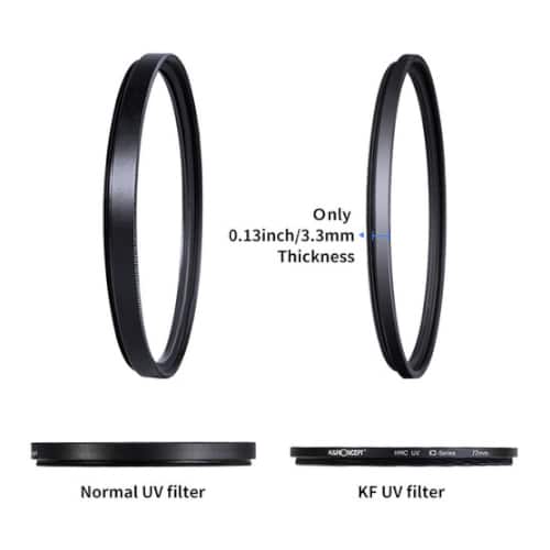Los filtros UV de K&F Concept están hechos de vidrio japonés y protegen su lente de la suciedad del polvo, los arañazos, las huellas dactilares y los daños accidentales.