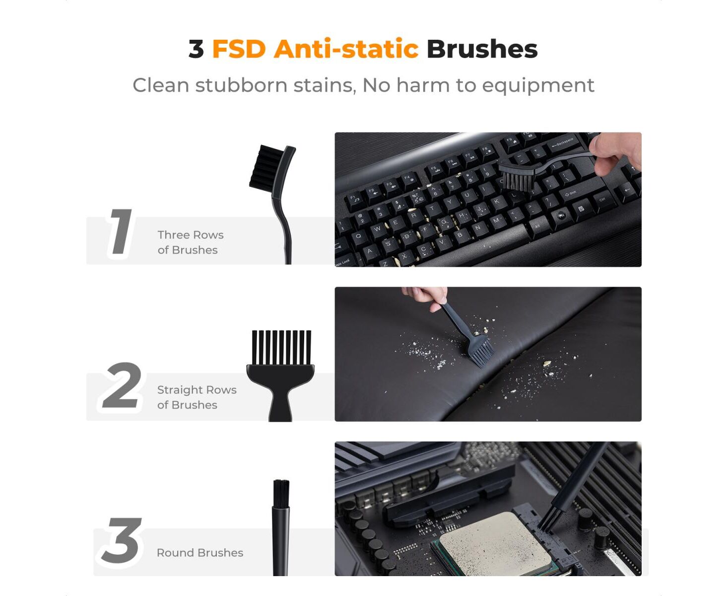 Este soplador multifuncional incluye 5 boquillas y cepillos que permiten adaptar el flujo de aire a diferentes tareas: limpieza de cámaras, sensores, teclados, automóviles, equipos electrónicos o incluso inflado de flotadores.