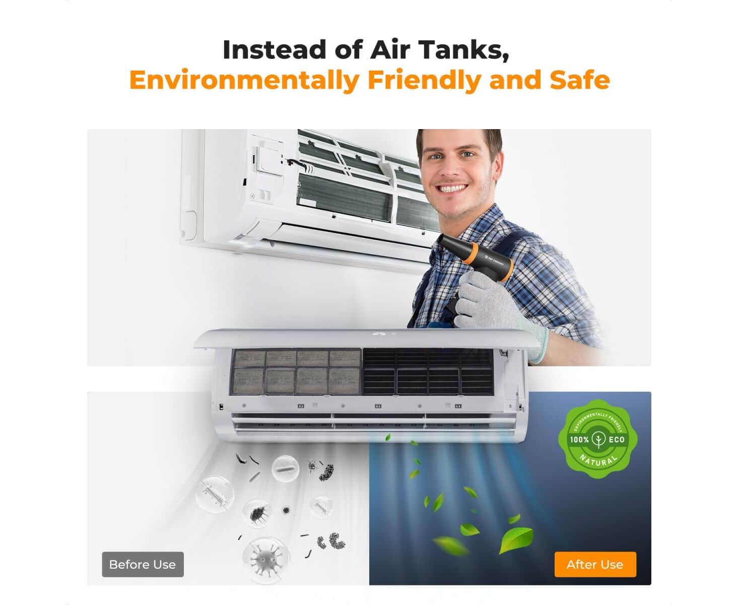 Diseño inalámbrico, portátil y sostenible — alternativa ecológica a las latas de aire comprimido.