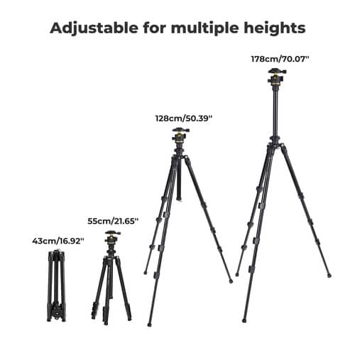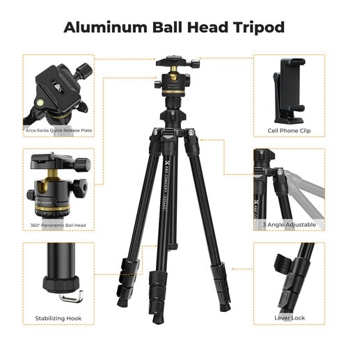 . El K&F CONCEPT KF09.149 es un trípode de viaje profesional, ideal para fotógrafos y videógrafos que requieren estabilidad, movilidad y precisión. Con un marco ligero de magnesio y aluminio, este modelo combina robustez con portabilidad. Las patas de bloqueo abatible de 4 secciones permiten ajustes rápidos y seguros, mientras que la cabeza de bola BH-36 con base panorámica de 360° ofrece una excelente libertad de encuadre. La compatibilidad con las tarjetas Arca lo hace versátil para una variedad de sistemas de cámara. Con una altura máxima de 177,8 cm y un mínimo de solo 54,9 cm, se adapta a diferentes escenarios de disparo.