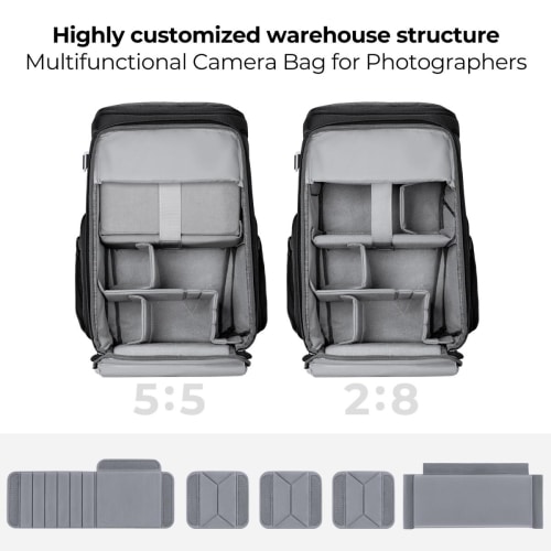 • . Diseño Magic Bin con compartimento transformable (5:5 o 2:8) empujando hacia arriba o hacia abajo, ideal para diferentes contextos de uso como fotografía urbana, retratos o VLOGs