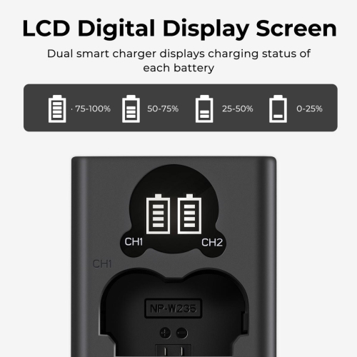 Entrada: 5V / 2.1A, diseño de doble ranura, puede cargar dos baterías NP-W235 al mismo tiempo. Una vez encendido el cargador, puede verificar el progreso de carga de cada batería a través de la pantalla LCD