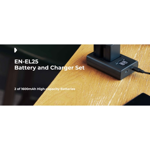 - El conjunto de carga incluye 2 baterías de repuesto Canon EN-EL25 1600mAh – 7.4V – 8.1Wh para Nikon y un cargador de interfaz dual Micro USB/Tipo-C, que es fácil de transportar