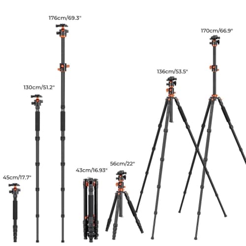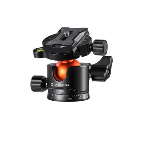 El trípode de aleación de aluminio BH-36L T255A4 de KF Concept con cabeza esférica es un trípode de viaje liviano que proporciona una altura máxima de 1,70 m y una capacidad de carga de hasta 16 kg, lo que lo hace adecuado para cámaras compactas, sin espejo y DSLR con lentes grandes. Incluye una cabeza esférica, una columna central lateral y la capacidad de convertir una pata en un monopie.