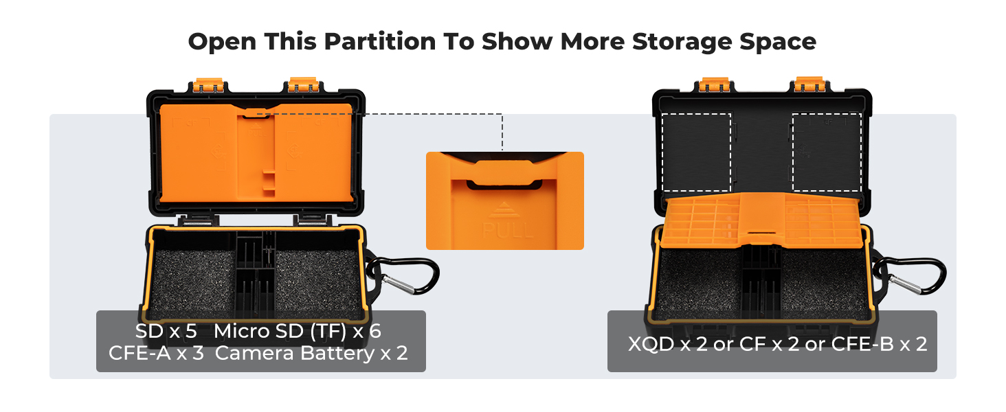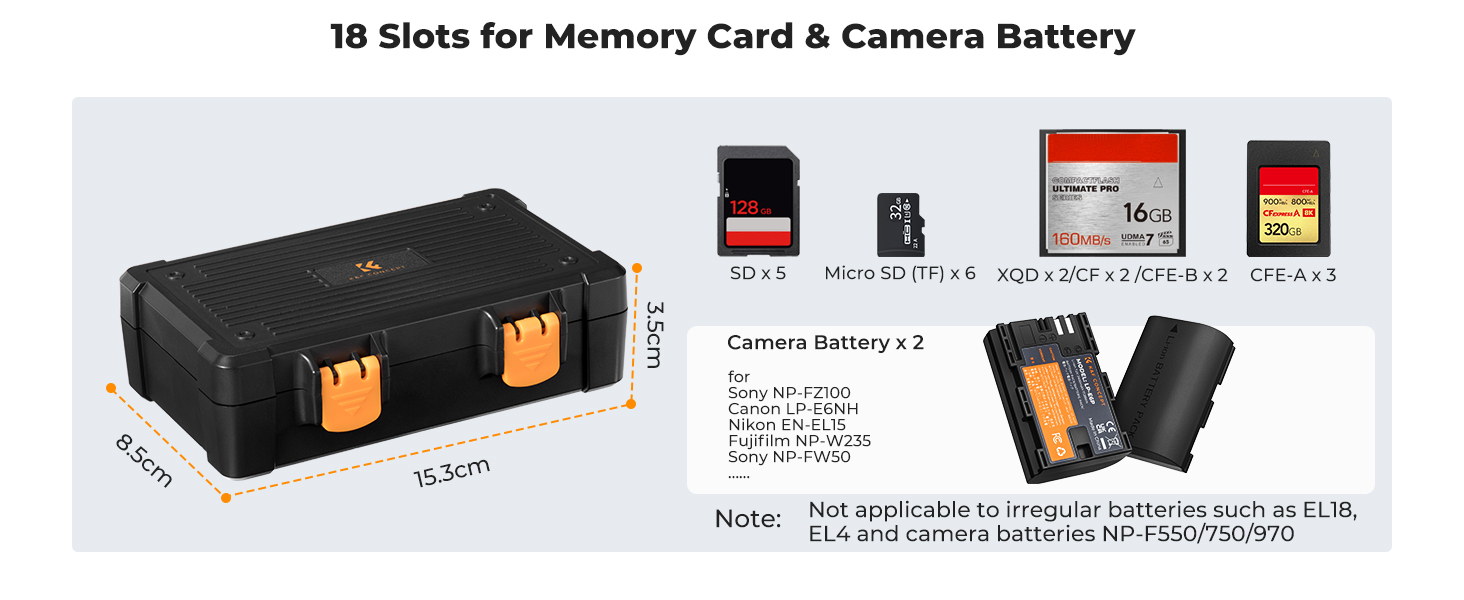Su capacidad de 18 slots permite almacenar hasta 2 baterías y 16 tarjetas de distintos formatos, incluyendo SD, microSD (TF), CF, XQD y CFe-A. Los compartimentos internos están diseñados con precisión para mantener cada elemento firmemente en su lugar, evitando movimientos y posibles daños durante el transporte.