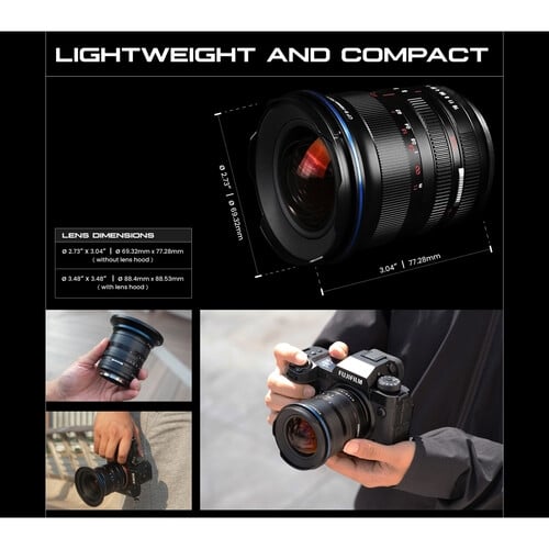 - Captura perspectivas más amplias mientras ahorras espacio en la bolsa de tu cámara con el Laowa 8-16mm f/3.5-5 Zoom CF de Venus Optics. Con un peso increíblemente bajo y un rango focal versátil, este objetivo es perfecto para los fotógrafos en movimiento que se benefician de una configuración de cámara ligera. Con un ángulo de visión que oscila entre 82,9 y 120,9 grados, este objetivo te permite capturar paisajes y retratos de gran angular desde puntos de vista únicos.