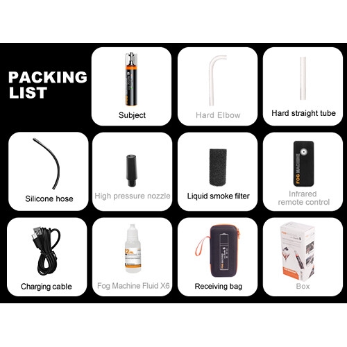 - Su batería recargable permite hasta 25 minutos de uso continuo, por lo que es ideal para eventos móviles o grabaciones al aire libre. El funcionamiento inalámbrico a través del mando a distancia garantiza comodidad y flexibilidad, mientras que los accesorios incluidos le permiten personalizar la dirección y la intensidad de la emisión de humo.