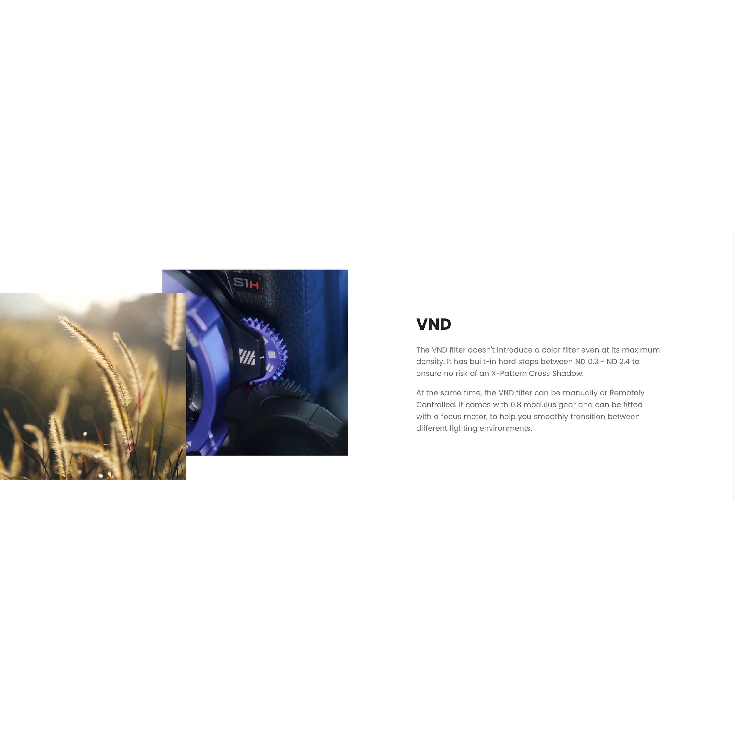 • Incluye Filtro ND Variable (0,3–2,4) con engranaje MOD 0.8