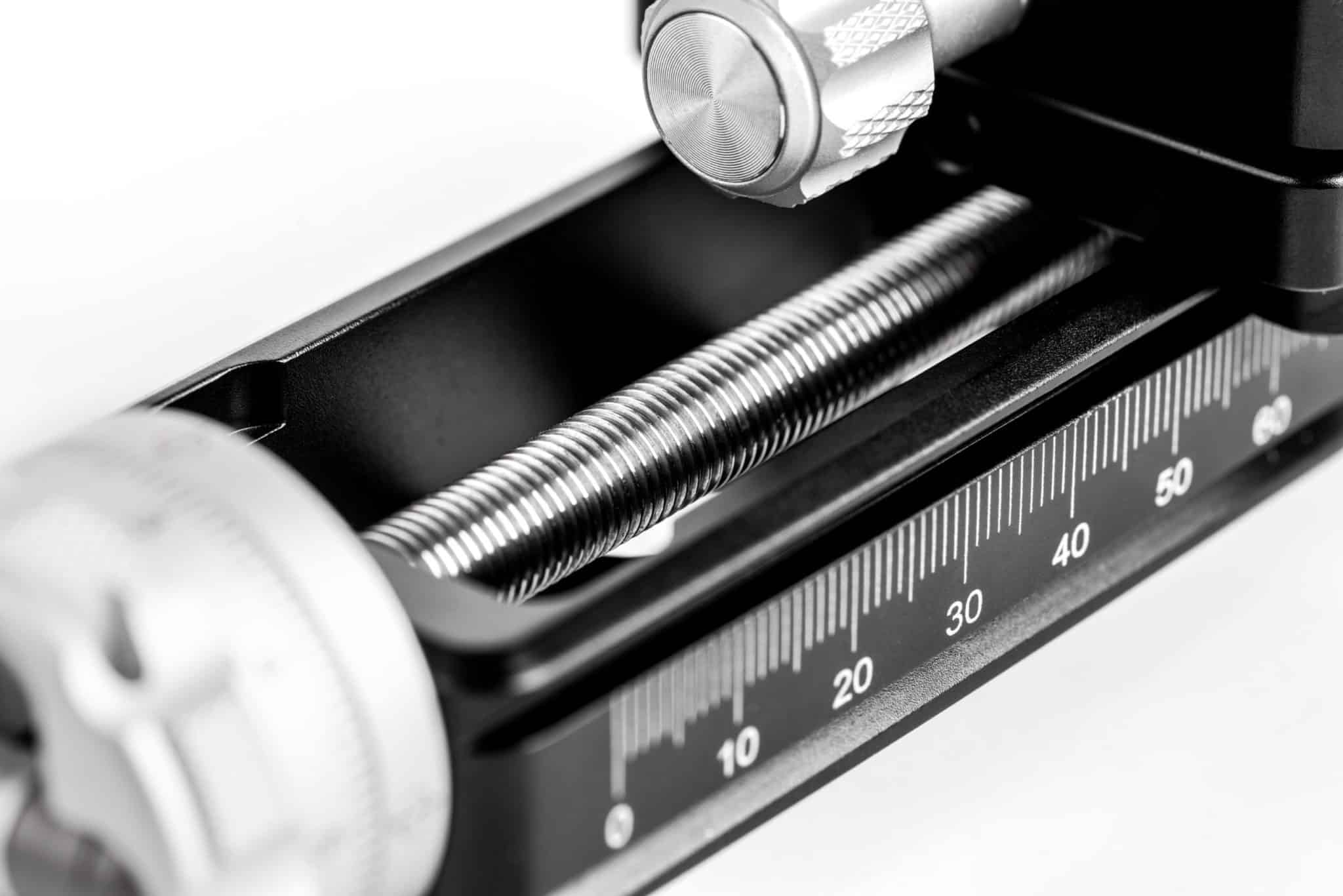 O Macro Rail pode ser montado na maioria das cabeças tipo Arca/ball heads do mercado e também inclui quatro pregos de pé destacáveis que permitem o uso do trilho diretamente no tampo da mesa. O deslocamento da sapata por volta é de 1,25 mm com marcas de índice gravadas em ambos os lados do trilho para ajustes finos. A parte inferior do trilho inclui furos de parafuso de 3/8” e ¼” que permite o uso de todas as cabeças de tripé.