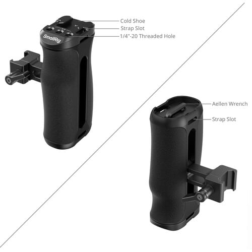 Tiene orificios roscados integrados de 1/4″-20 para fijar accesorios como abrazaderas de banco de energía o brazos mágicos. Además, tiene un soporte de zapata fría incorporado para colocar accesorios como soportes para monitores, luces LED y micrófonos para mejorar su experiencia de disparo. La llave Allen magnética integrada facilita el ajuste del adaptador de la empuñadura.