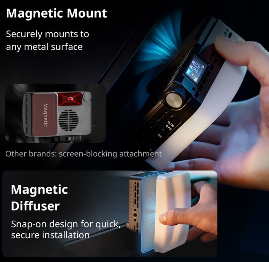 A sua faixa de temperatura entre 2500K e 10000K permite criar ambientes precisos, desde tons quentes até luz diurna cristalina, enquanto os 14 efeitos de iluminação adicionam criatividade instantânea a qualquer produção. O sistema magnético integrado facilita a montagem em superfícies metálicas, tornando-a perfeita para setups rápidos e flexíveis.