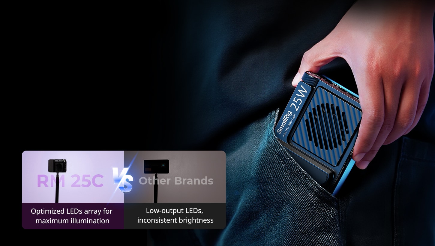 La SMALLRIG RM 25C redefine lo que una mini luz portátil puede oferecer. Con uma potência de 25W, esta luz de vídeo combina RGB Full-Color, uma reprodução cromática de alto nível (CRI 96 | TLCI 99) e uma iluminação surpreendentemente intensa para um dispositivo do seu tamanho.
