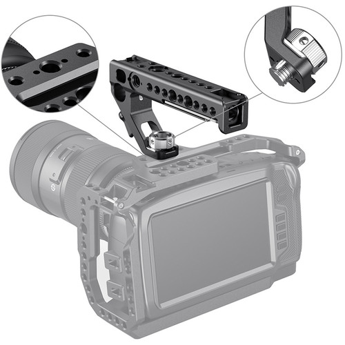El mango superior de montaje estilo ARRI de SmallRig utiliza un tornillo de mariposa de bloqueo de 3/8″-16 con pasadores de ubicación para sujetarlo de forma segura a la jaula de su cámara. Además de un soporte de varilla de 15 mm, este mango versátil tiene un bloqueo y dos soportes de zapata fría estándar, tres roscas antitorsión estilo ARRI y múltiples roscas de 1/4″-20 y 3/8″-16.