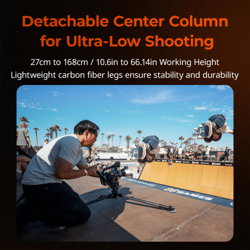 - Columna central desmontable: altura de trabajo de 27 a 168 cm, lo que permite tomas de ángulo ultra bajo para una amplia variedad de perspectivas creativas.