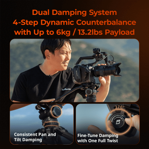 El cabezal fluido permite ajustes suaves con control continuo de giro e inclinación, mientras que el sistema de contrapeso dinámico de 4 pasos admite cámaras de hasta 6 kg. La columna central desmontable facilita el disparo en ángulos bajos, y la compatibilidad con las placas de liberación rápida Manfrotto y DJI RS amplía sus posibilidades.