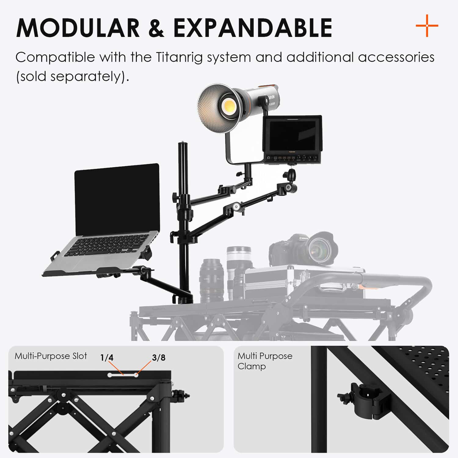 Gracias a su sistema modular ampliable, el TitanRig puede personalizarse e integrarse con nuevos accesorios o componentes según las necesidades de cada producción.