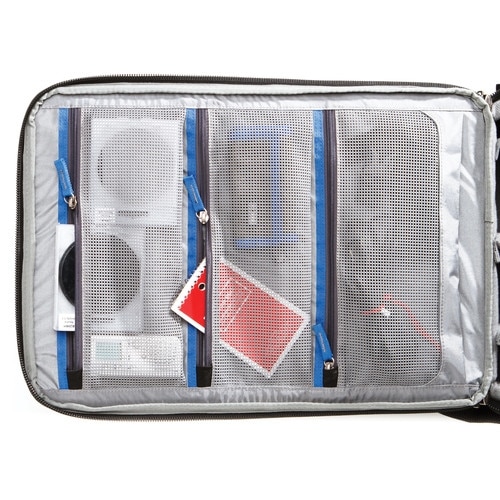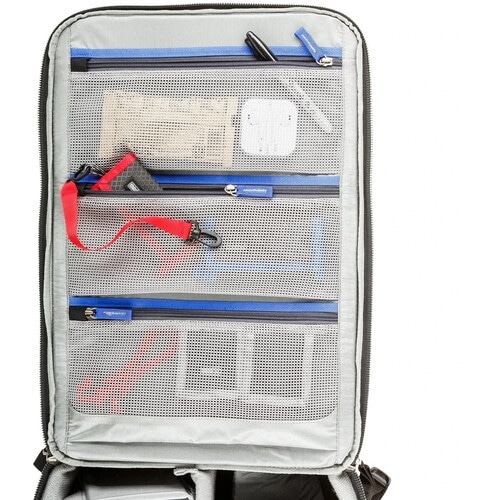 - La solapa interior tiene bolsillos de malla laminada transparente para varios accesorios como blocs de notas, barras energéticas, billeteras para tarjetas de memoria, libros de instrucciones y otros artículos