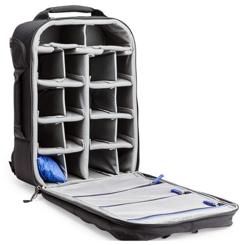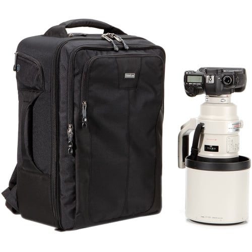 - La mochila negra Airport Accelerator de Think Tank es una mochila enorme diseñada para el profesional serio que necesita llevar un sistema de cámara completo. Esta enorme mochila tiene capacidad para dos DSLR profesionales, así como 6-8 zooms básicos adicionales, incluido su 500 mm f/4 conectado a un cuerpo o un 600 mm f/4 sin capucha. Más grande que la Airport Commuter de Think Tank, esta mochila contiene las mismas características, pero a mayor escala. Tu portátil de 17″ y tu iPad se guardan en su propio compartimento separado con cremallera.