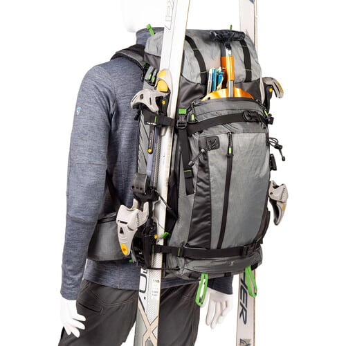 Esta mochila MindShift Gear BackLight Elite 45L Gris está diseñada para satisfacer los intereses combinados del fotógrafo de aventuras y los entusiastas de los deportes de invierno. A lo largo de la parte delantera y los lados de esta mochila, múltiples correas de compresión y correas de equipo permiten que los esquís, tablas de snowboard, raquetas de nieve u otro equipo de montaña al aire libre, como un piolet o bastones de senderismo, se enganchen y transporten convenientemente. En el interior, el espacioso compartimento principal tiene capacidad para una bolsa de equipo de cámara incluida. La bolsa de equipo y sus diez divisores acolchados con solapa táctil pueden acomodar un kit de dos cámaras DSLR, con tres lentes principales y una lente de zoom de 16-35 mm, 24-70 mm y 70-200 mm. Alternativamente, la bolsa del dispositivo se puede configurar para un kit multimedia con dos cámaras sin espejo, tres lentes de zoom, una lente principal y un pequeño dron.