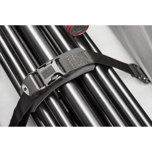 - Las correas de sujeción con cómodas hebillas de liberación lateral evitan que un trípode de video u otro dispositivo de soporte se mueva durante el transporte