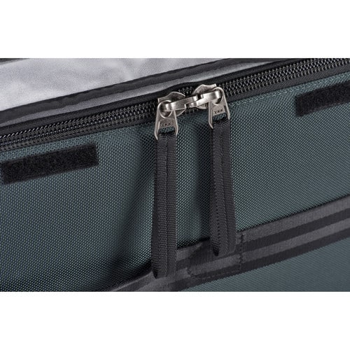 - Dentro de los paneles laterales reforzados y resistentes al aplastamiento del Video Tripod Manager 44, las almohadillas ajustables en todo el compartimento principal permiten que el soporte se concentre donde más se necesita, como alrededor de las partes móviles de la cabeza del trípode. Una cremallera resistente a la abrasión se extiende alrededor de la parte superior e inferior de este estuche con ruedas, así como en un lado. Después de colocar el panel trasero del Video Tripod Manager 44 contra el suelo de modo que el panel frontal quede hacia arriba, se puede acceder al compartimento principal abriendo la cremallera. Los rieles deslizantes elevan el panel trasero, protegiéndolo de abrasiones y humedad. Después de soltar la cremallera, el panel frontal se puede abrir para revelar dos bolsillos de malla con cremallera, que se pueden usar para almacenar y organizar cintas, cables o herramientas. Las correas táctiles incluidas forman dos bisagras a lo largo de los bordes interiores de esta bolsa con ruedas, evitando que el panel frontal se abra hacia arriba en un ángulo de más de 90° aproximadamente. Mientras están en su lugar, las bisagras ayudan a garantizar que el interior del panel frontal y sus bolsillos miren hacia el usuario y sean de fácil acceso al acceder al compartimento principal. Las múltiples correas de sujeción con cómodas hebillas de liberación lateral evitan que un trípode de vídeo u otro dispositivo de soporte se mueva durante el transporte, y el revestimiento inferior interior del Video Tripod Manager 44 cuenta con una superficie fácil de limpiar diseñada para pies de trípode u otros componentes que comúnmente entran en contacto con las superficies del suelo.