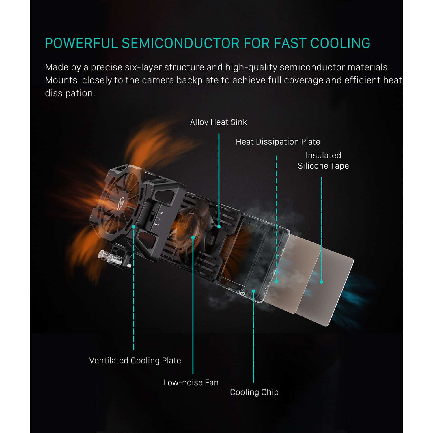 Equipado con un ventilador turbo de 7 aspas y un semiconductor de alta eficiencia, el sistema garantiza una disipación térmica rápida y uniforme. Su estructura de seis capas y materiales de alta calidad permite mantener un rendimiento estable incluso en grabaciones 4K con altas tasas de fotogramas.