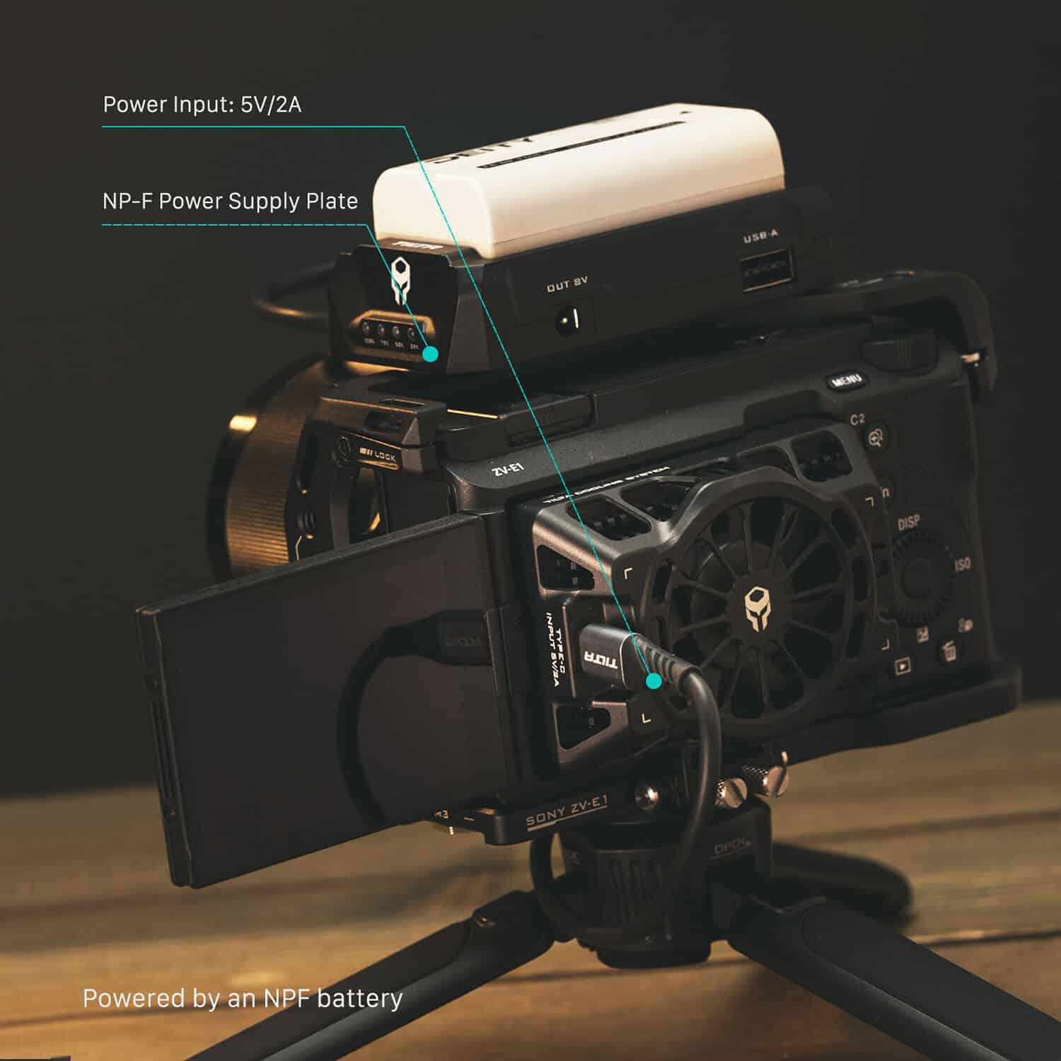 El diseño articulado permite inclinar el módulo hasta 90°, asegurando compatibilidad total con la pantalla abatible de la ZV-E1 y facilitando el almacenamiento. El control de velocidad integrado ofrece una flexibilidad total, permitiendo ajustar el nivel de refrigeración según las necesidades de cada grabación. Alimentado mediante USB-C, el sistema puede conectarse a power banks o placas de batería externas, lo que lo convierte en una solución ideal para producciones largas y configuraciones profesionales.