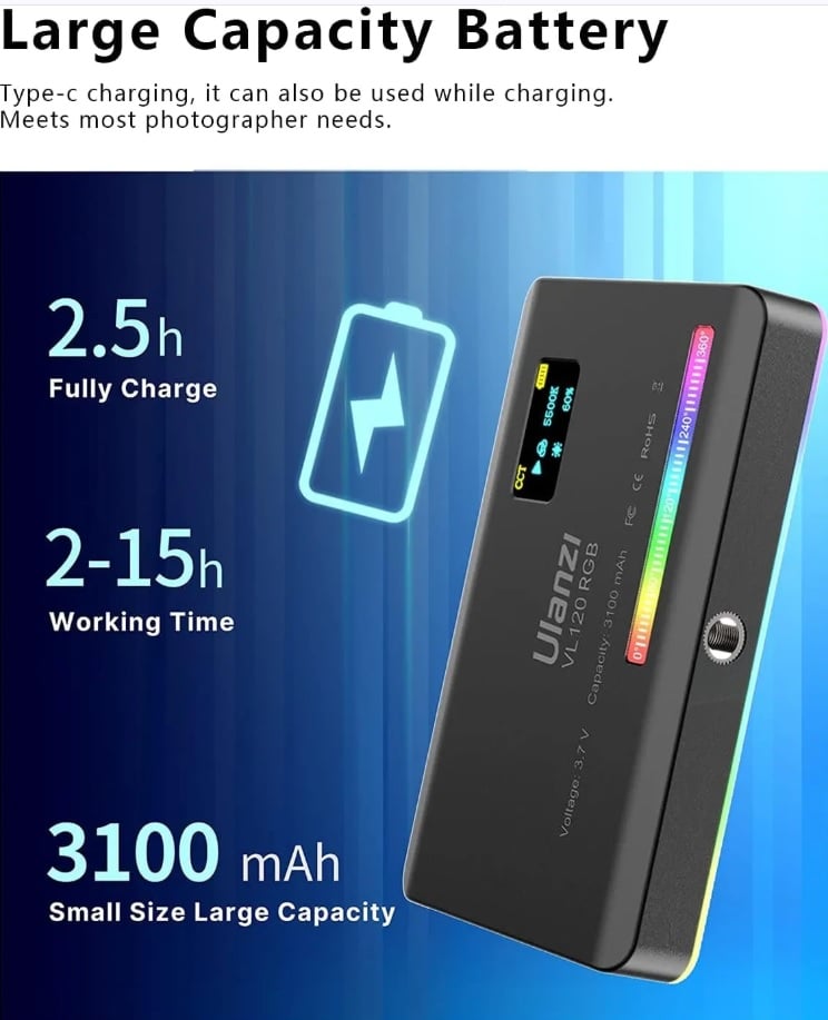 Equipado con una batería recargable de 3100 mAh, el VL120 ofrece una autonomía de entre 1,5 y 3 horas, según el nivel de brillo, y se carga completamente en aproximadamente 2,5 horas mediante USB-C. La pantalla OLED facilita un ajuste rápido e intuitivo de los parámetros, mientras que la rosca 1/4″-20 y el adaptador de zapata incluidos aseguran un montaje sencillo en cámaras, trípodes o rigs.