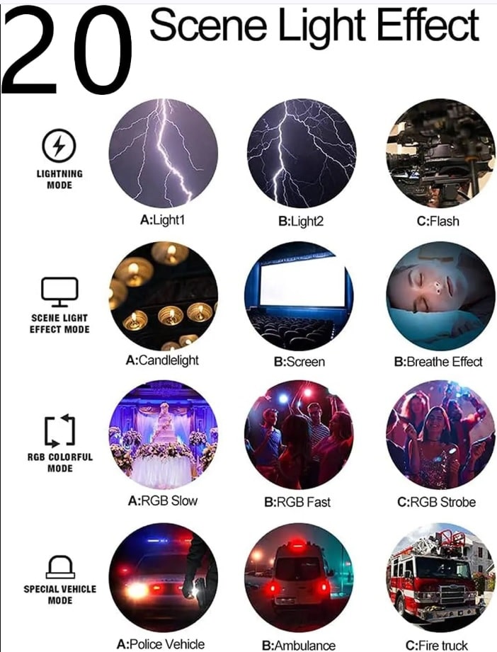 | Modos de color | Bi-color + RGB 2 LED blancos. 42 LED cálidos. 36 LED RGB. Efectos creativos: incluye 20 efectos de escena preprogramados (como ambulancia, fuegos artificiales, luz de velas, etc.). |