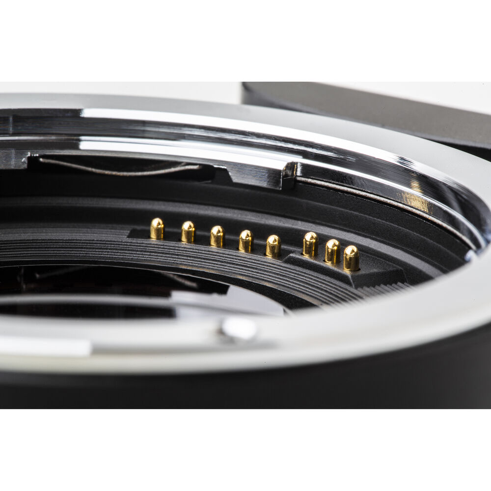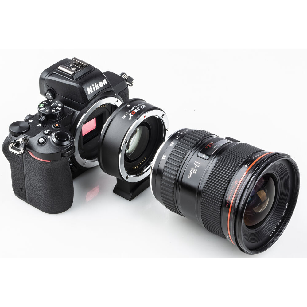Este adaptador EF-Z2 con Speed Booster de Viltrox permite utilizar un objetivo EF de Canon en un cuerpo de cámara Nikon Z. La unidad incorpora un multiplicador óptico de 0,71x y los contactos electrónicos están dorados con cobre puro. Se admite la comunicación electrónica entre la cámara y la lente, lo que permite el enfoque automático. Con algunas lentes, el rango de enfoque máximo puede verse afectado, ya que la distancia entre la lente y el sensor de la cámara se modifica ligeramente y hay un aumento de 1 punto en la luz hacia la cámara en el rango de apertura de la lente. Además, las funciones de algunos objetivos no están totalmente disponibles según el cuerpo de la cámara.