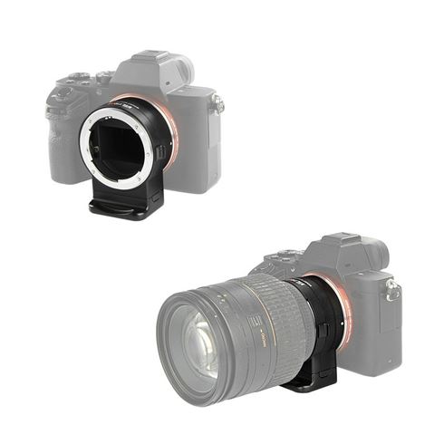 Este adaptador de montura de lente de Viltrox está diseñado para permitir que uno objetivo de montura Nikon F (solo tipo AF-S) se use con una cámara Sony E con comunicación electrónica completa. La parte inferior de la pata de trípode desmontable de este adaptador está roscada con una rosca accesoria de 1/4″-20, lo que proporciona una conexión directa a trípodes o placas de liberación rápida que cuentan con monturas de 1/4″-20. Para facilitar la actualización de su firmware, este adaptador también incluye un puerto micro-USB.