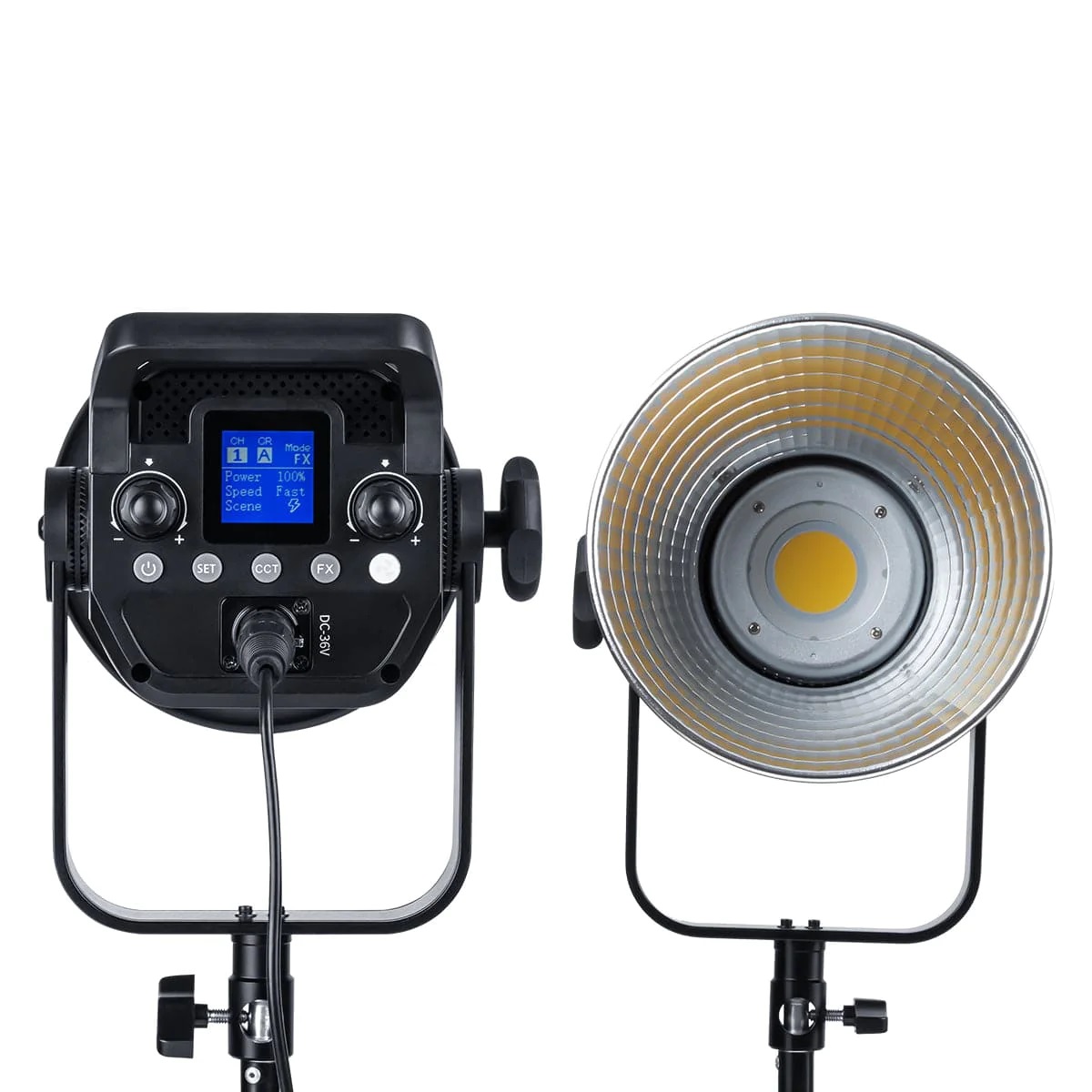 - El LED COB de 200 W proporciona una salida CRI alta con reproducción de color precisa y control de atenuación de 0-100 %.