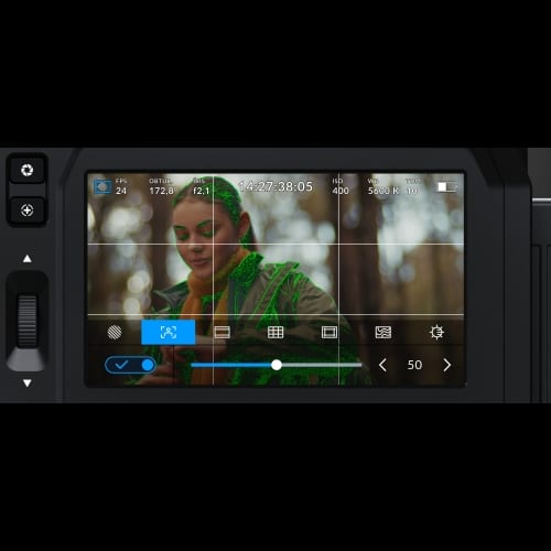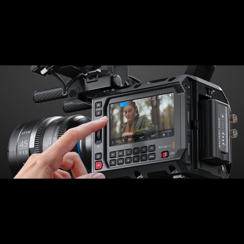 O ecrã LCD touchscreen de 4” com brilho de 1500 nits permite uma visualização clara em ambientes externos, enquanto a interface permite ajustes rápidos. A câmara oferece múltiplas taxas de quadro, com até 120 fps em 1080 HD, adaptando-se a várias exigências de filmagem. A Blackmagic PYXIS 6K grava em formatos Blackmagic RAW com compressão ajustável e suporta proxies H.264, permitindo diferentes configurações de armazenamento e pós-produção.