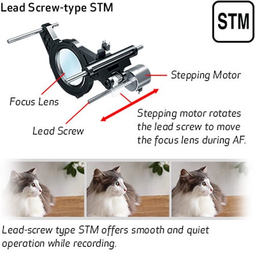 - O motor de passo STM oferece desempenho de foco automático rápido, silencioso, suave e preciso que beneficia tanto as necessidades de fotos quanto de gravação de vídeo.