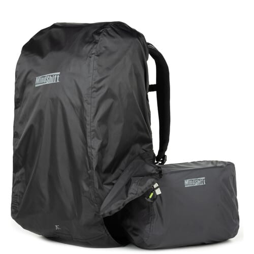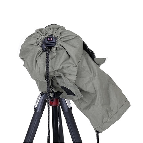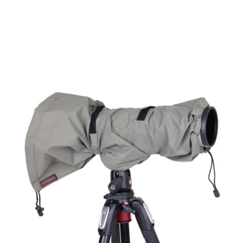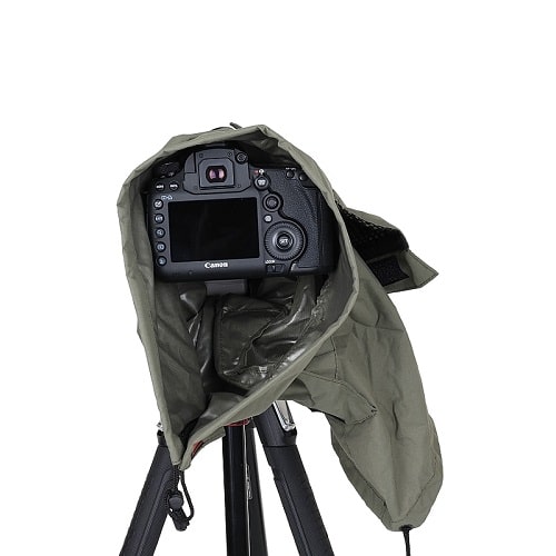 A capa para chuva protege uma câmara DSLR com a lente acoplada e é fabricada em material leve, respirável e impermeável.