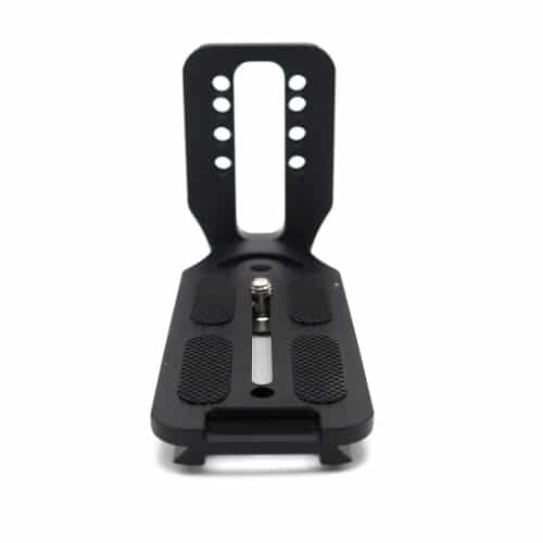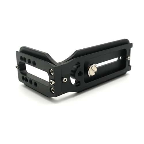 Sapata em L com encaixes arca-swiss e mosquetão com rosca de 1/4″. Esta sapata torna a sua câmara directamente compatível com cabeças de encaixe Arca-Swiss possibilitando colocar a câmara na vertical directamente numa cabeça de tripé ou noutros acessórios. As entradas de rosca de 1/4″ permitem também acoplar acessórios na lateral , tais como magic arms, pegas, entre outros.