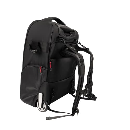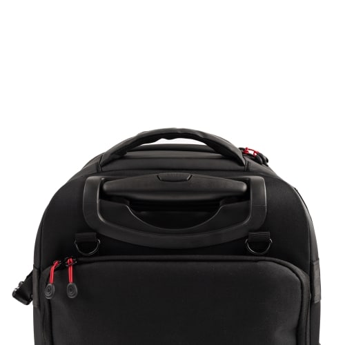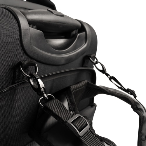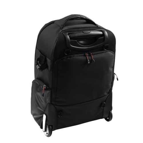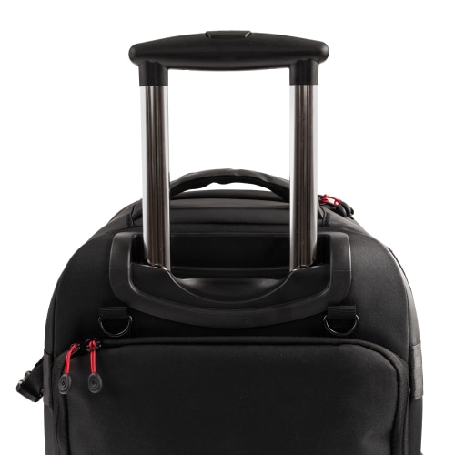 - Sistema de transporte: Alças de ombro ajustáveis e acolchoadas, pega extensível e rodas embutidas