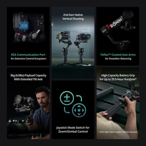 O punho de bateria RS 4 apresenta um design de cartucho, tornando mais fácil a troca de baterias e menor para armazenamento. Pode até ser carregado separadamente do gimbal. O novo punho da bateria oferece uma autonomia prolongada de até 12 horas, o suficiente para fotografar continuamente durante todo o dia. Ele suporta carregamento rápido PD de 18 W com um tempo de carga de apenas 2,5 horas. Ele pode até ser usado durante o carregamento para manter o RS 4 ligado quase indefinidamente.