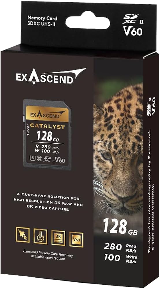 O EXASCEND Catalyst SDXC UHS-II V60 de 128 GB foi desenvolvido para acompanhar as exigências da fotografia e cinematografia modernas, oferecendo velocidades elevadas e fiabilidade absoluta mesmo em cenários de gravação intensiva. Com suporte para vídeo até 8K, este cartão garante gravações contínuas sem perda de frames, graças à sua classificação V60, que assegura uma velocidade mínima de escrita constante.