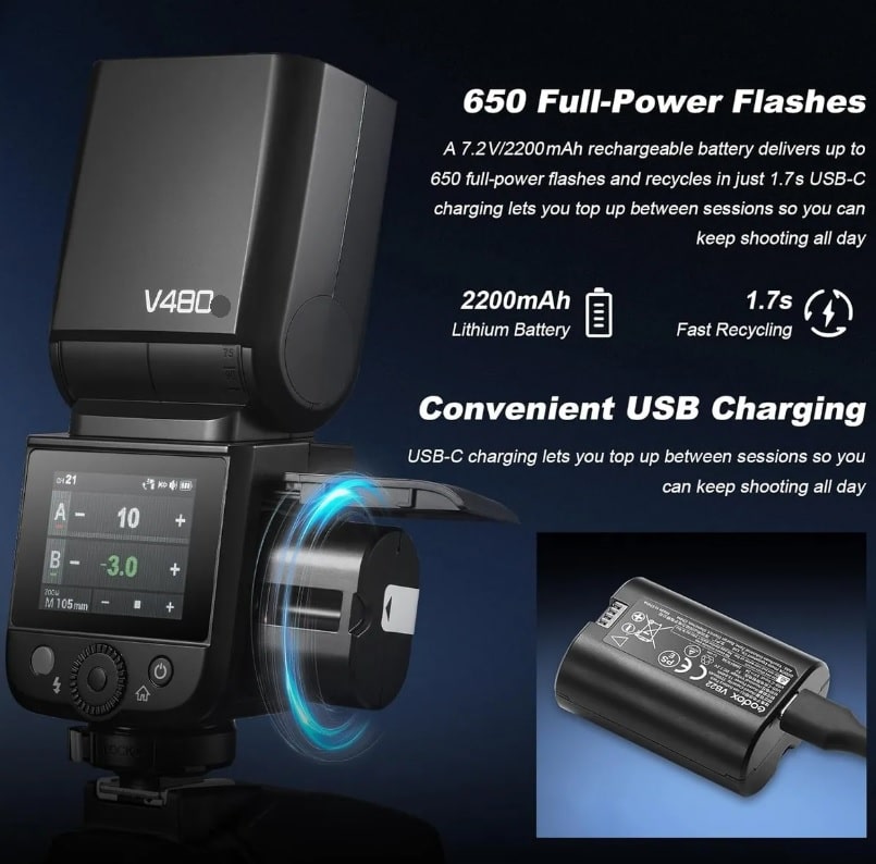 Esta bateria é perfeita para fotógrafos profissionais e entusiastas que utilizam o flash Godox V480 TTL em sessões de estúdio ou eventos, e que valorizam autonomia prolongada, recarga rápida e a comodidade do carregamento USB-C.