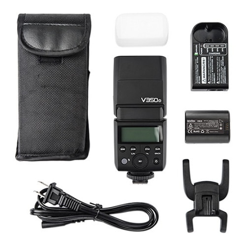 - Flash Godox V350O para câmeras selecionadas da Olympus e Panasonic