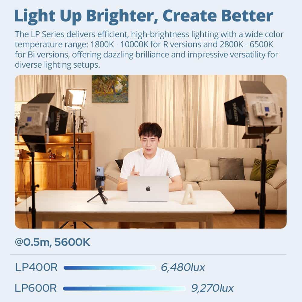 Com um CRI e TLCI de 96, o LP600R assegura cores naturais e realistas, fundamentais em retrato, produto e vídeo. O seu controlo inteligente via App Godox Light permite ajustar intensidade, tonalidade e modos de cor à distância, facilitando o trabalho em estúdio ou em produções móveis.