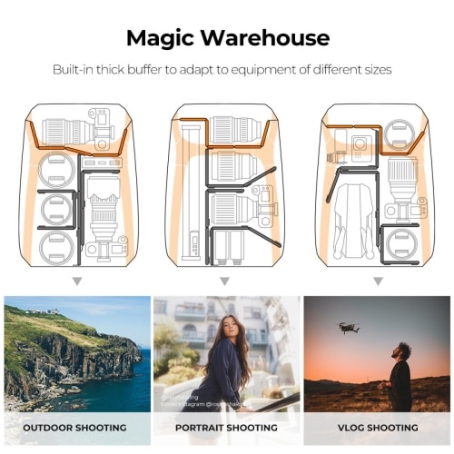 Mochila de grande capacidade, que pode conter até 2 câmaras, 4 lentes, PC de 15,6″, tablet 10,5″, tripé e outros itens essenciais. Na camada superior suspensa podem ser guardados objectos pessoais,roupa, etc.