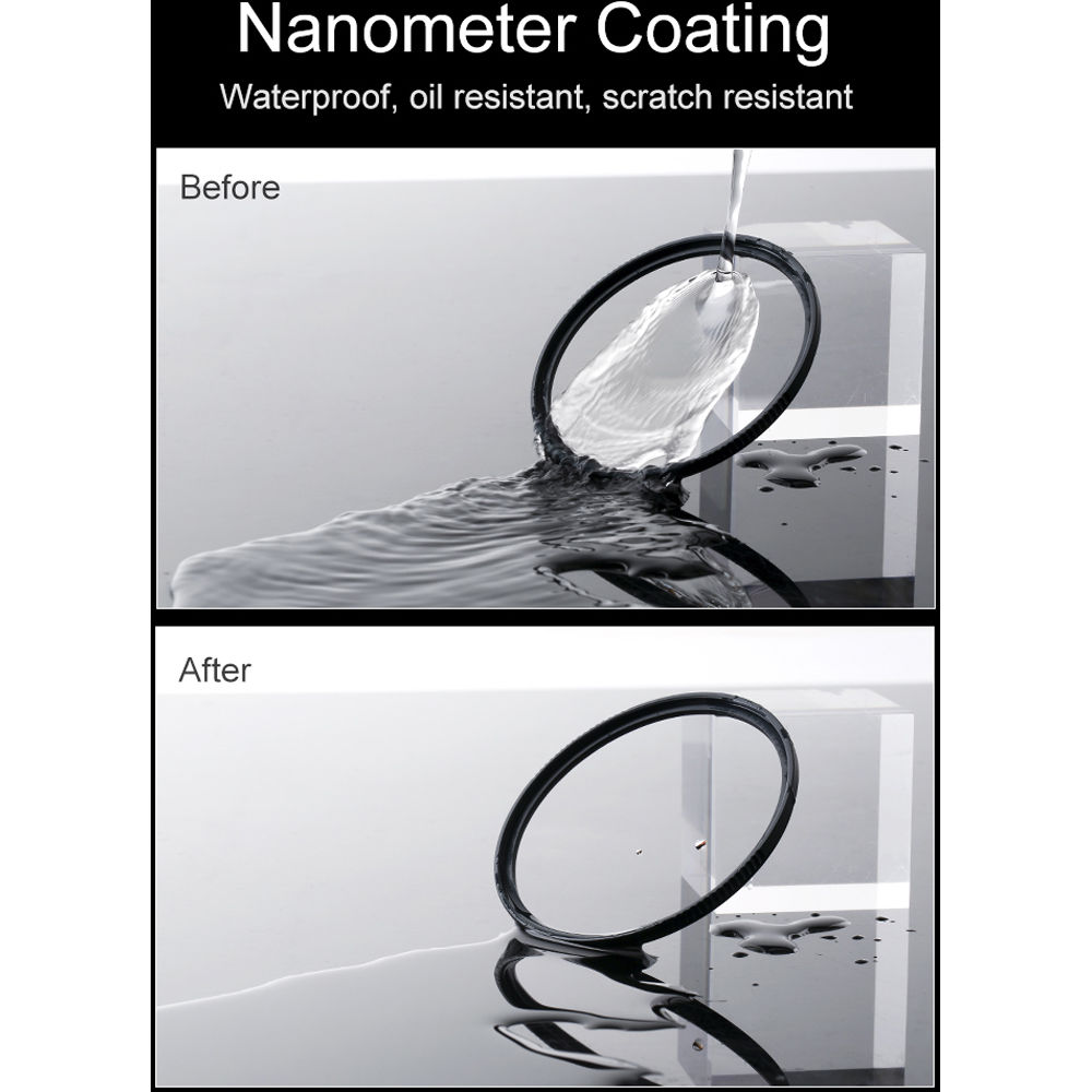 A inovadora tecnologia NANOTEC da K&F Concept aplica 28 camadas de revestimento em ambas as faces do vidro. Esta nanotecnologia confere ao filtro propriedades hidrofóbicas e oleofóbicas, tornando a limpeza rápida e fácil, mesmo após contacto com gotículas de água ou impressões digitais. Com uma taxa de transmissão de luz de 99,6%, o filtro garante que a cor verdadeira das suas imagens não é afetada, ao mesmo tempo que elimina o embaçamento (neblina) induzido pelo UV e potencia o contraste.