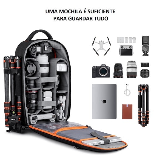 Uma mochila de alta qualidade com uma grande abertura principal que oferece várias opções de armazenamento para as suas câmaras DSLR, lentes, tripé, flashes, laptop de 15,6″ e outros acessórios. Alças largas para transporte confortável e um design neutro para o uso diário. Capacidade para 2 câmaras e 4 lentes extras, tripé, drone, laptop de 15,6″ e mais acessórios. Superfície à prova d’água com capa de chuva para proteção contra intempéries.